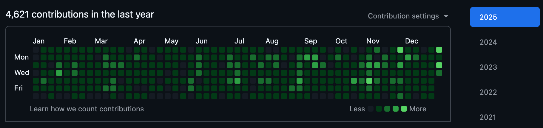 2025年はここ数年の中では、かなりコードを書いた年になった。GitHub のコントリビューション数は 4621 で、ログが残っている2008年からの期間では2番目にコントリビューションが多い年になった。(2024年は 1701 コントリビューション、一番多かったのは 2013年の 6013 コントリビューション)
